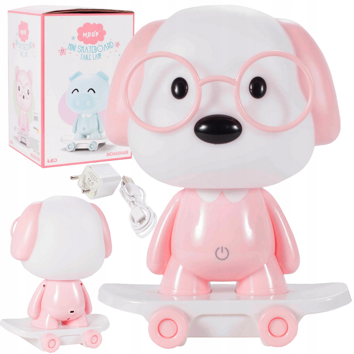 Urocza lampka nocna do pokoju dziecięcego w kształcie pieska na deskorolce. Dzięki takiej lampce maluch będzie spokojniej i szybciej zasypiać, a emitujące światło nie będzie w niczym przeszkadzać.