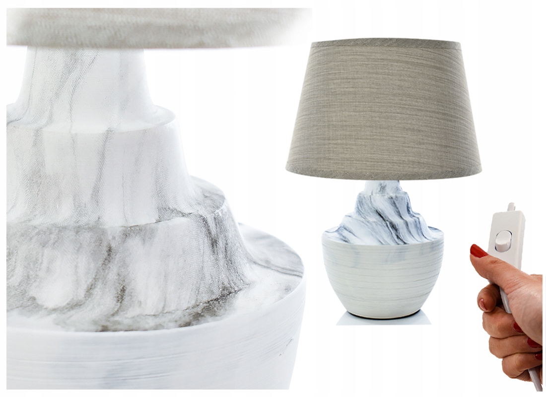 Lampka ma 30 centymetrów wysokości i 19cm szerokości, została solidnie wykonana. Posiada włącznik i wyłącznik, który jest wygodną opcją podczas użytkowania. Abażur wykonany jest z klejonego płótna o barwie szarości. Imitacja marmuru na ceramcznej nodze jest bardzo elegancka. Tonacja lampki napewno wpasuje się pod kolor tradycyjnych kanap, siedzisk, puff, zasłon, mebli tapicerowanych.