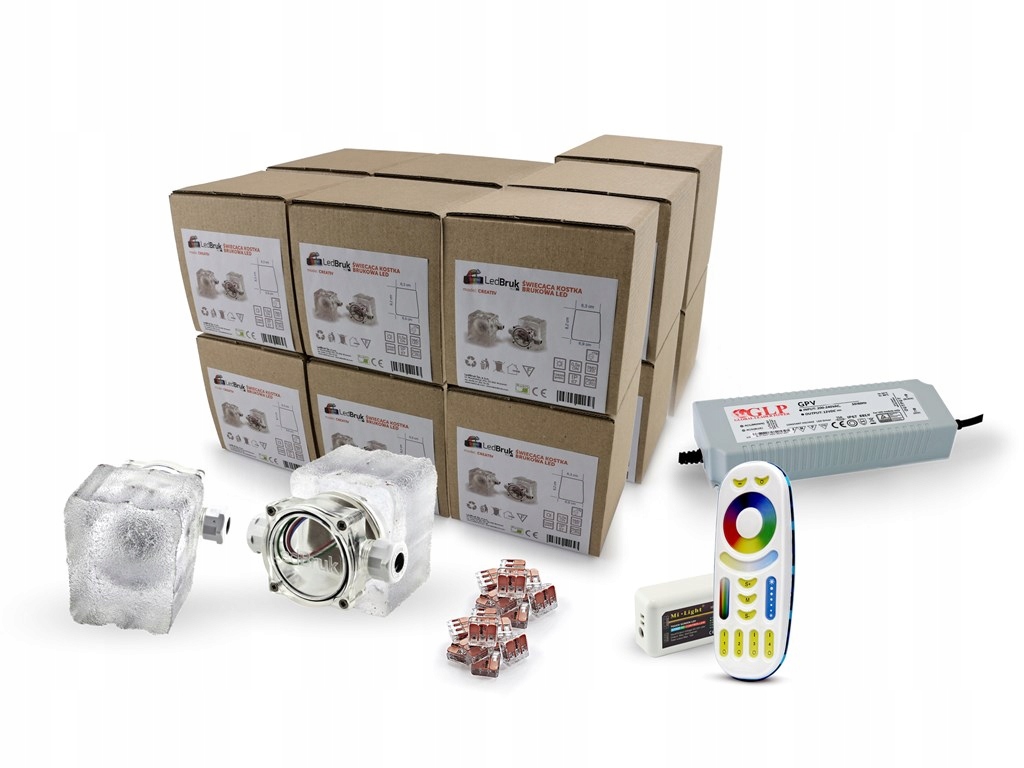 Składniki zestawu: Creativ - 14 sztuk, zasilacz IP67 - 1 sztuka, sterownik RGBW z pilotem Milight