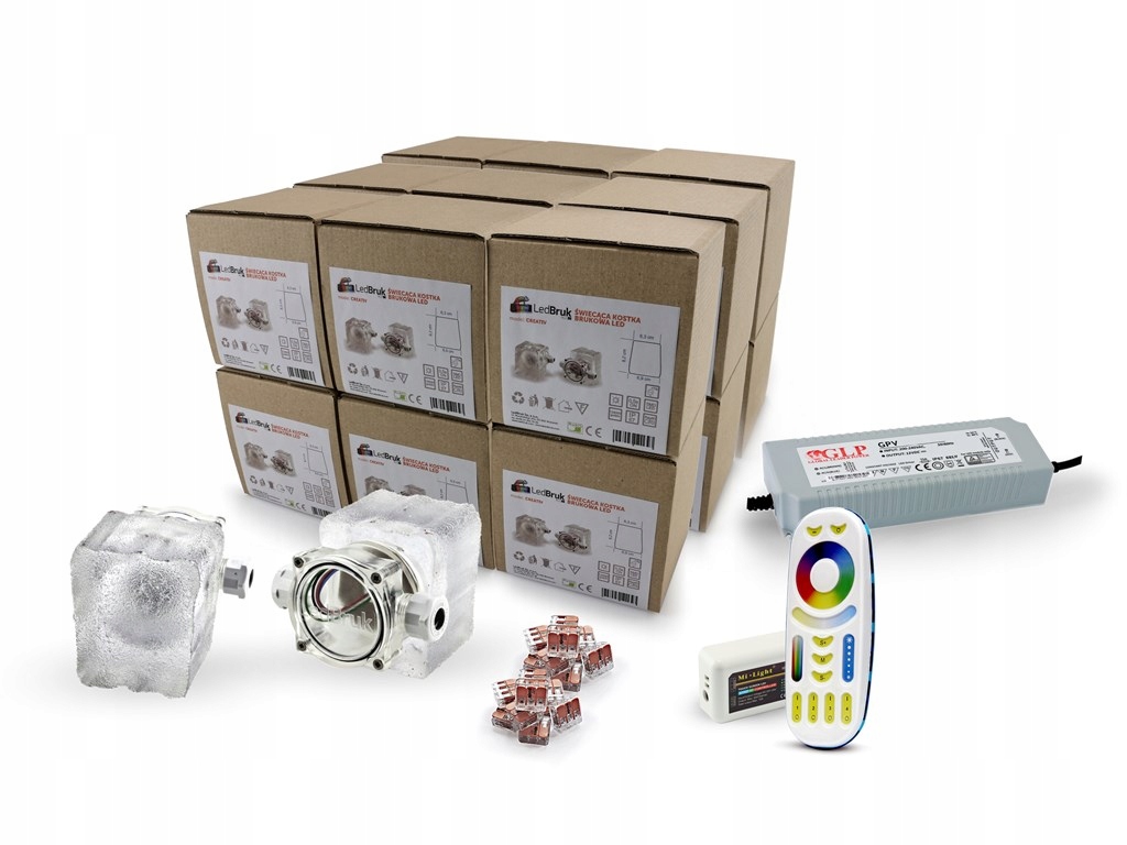 Składniki zestawu: Creativ - 18 sztuk, zasilacz IP67 - 1 sztuka, sterownik RGBW z pilotem Milight