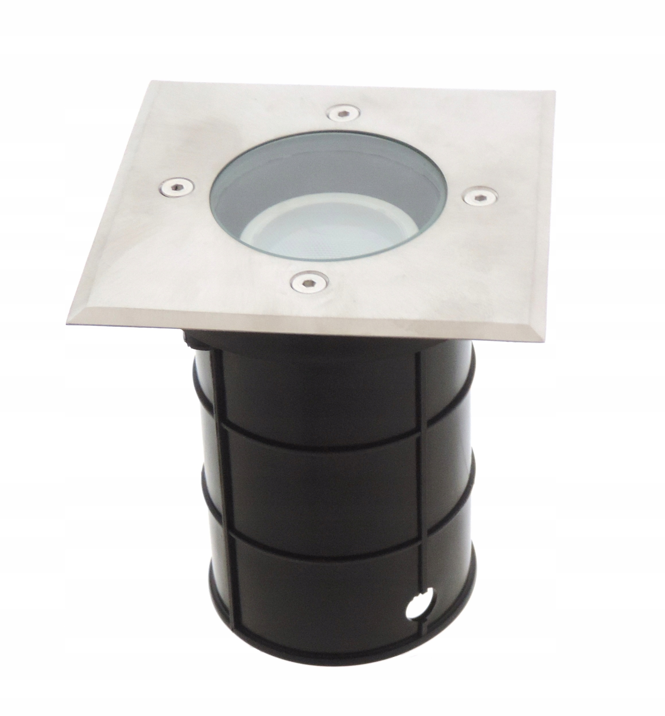 Oprawa najazdowa w kolorze INOX. Wykonana z odlewu aluminiowego oraz specjalnie wzmocnionej szyby co chroni źródło światła przed wpływem czynników zewnętrznych dzięki temu istnieje możliwość montażu w podłożu.