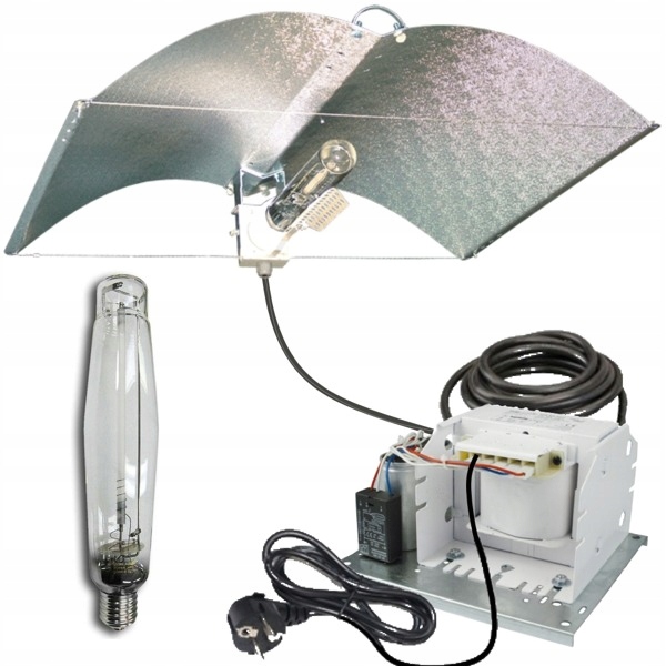 Kompletny zestaw HPS 1000WAdjust-A-Wing do doświetlania roślin, przeznaczony na fazę kwitnienia.