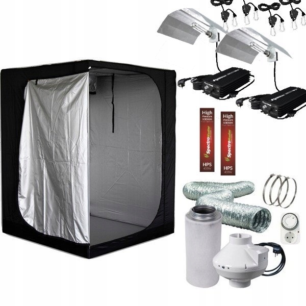 Wymiary: 150x150x200cm Objętość: 4,50m3 Materiał: 210D Silver Odbijalność: 80% Oświetlenie: 2xOdbłyśnik Spectromaster 50x50cm 2xZasilacz Spectromaster 600w 2xLampa Spectromaster HPS 600w Wentylacja: TT 160mm 555m³/h Filtr Eco fi160mm 620m³/h + akcesoria