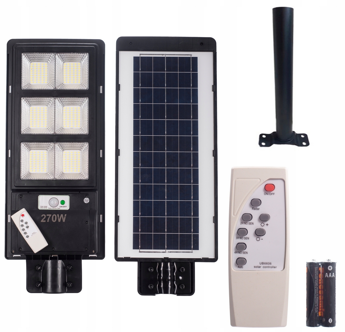 LAMPA ULICZNA SOLARNA LED 270 W Z PANELEM SOLARNYM, WYPOSAŻONA W CZUJNIK ZMIERZCHU I RUCHU + PILOT + UCHWYT