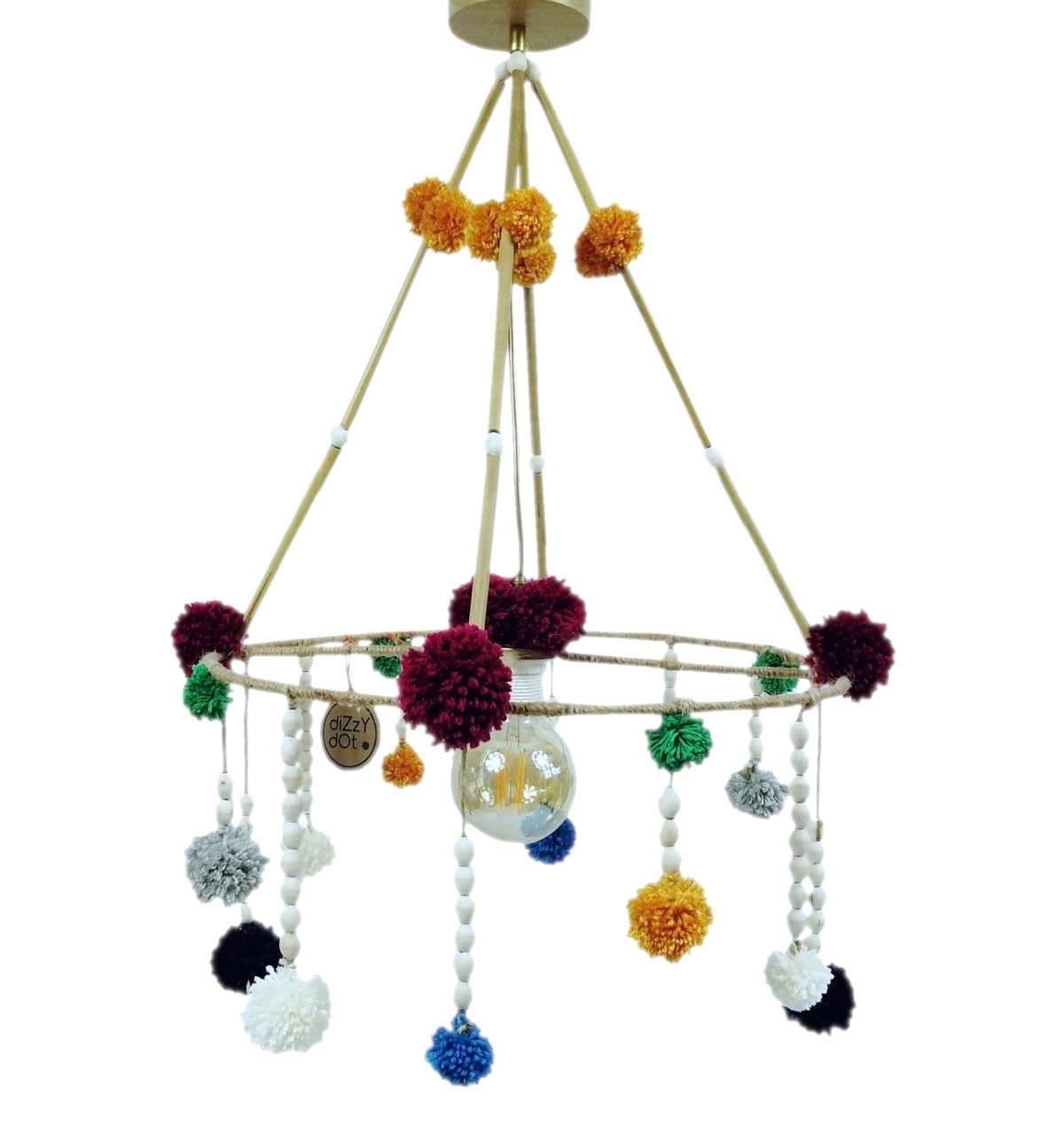 Lampa sufitowa autorskiego projektu, wzorowana na ornamentyce ludowej. Konstrukcja lampy zrobiona jest z metalowego drutu dzięki czemu lampa jest solidna. Ozdobą lampy są ręcznie wykonane pompony oraz drewniane koraliki. Góra wykonana została z użyciem sznura i bambusów. Do lampy dołączona jest dekoracyjna żarówka vintage dająca ciepłe światło, która dopełnia cały anturaż. Podsufitka została wykonana z drewna dębowego.