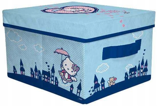 Niebieskie, zamykane pudełko na zabawki Hello Kitty.