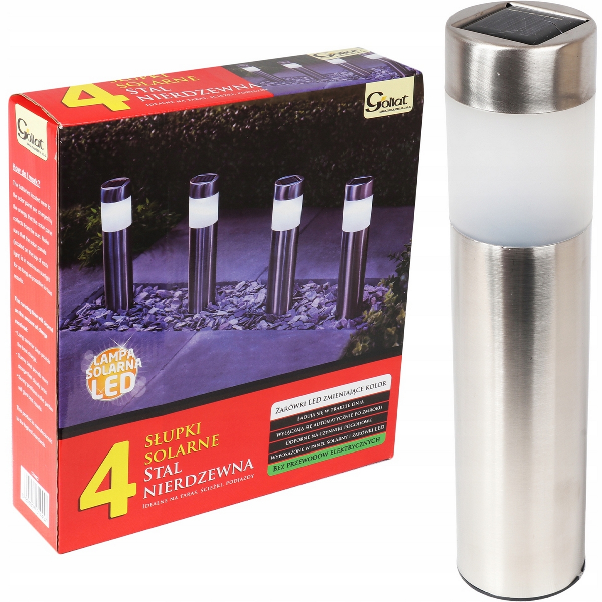 Komplet czterech lamp solarnych wykonanych ze stali nierdzewnej to gwarancja długiego użytkowania produktu. Zapomnij o kablach, wyposażone są w system solarny który ładuje się automatycznie w dzień dzieki promieniom słońca. Włączają się automatycznie po zmroku, wyposażone w panel solarny oraz żarówki led. Odporne na czynniki atmosferyczne.