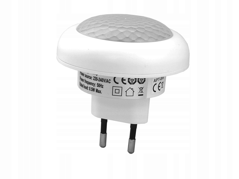 Lampka nocna LED z czujnikiem ruchu ZD18.Kompaktowa lampka LED wyposażona w czujnik ruchu. Miniaturowe rozmiary sprawiają, że lampka w całości zawiera się w podłączonym gniazdku sieciowym. Czujnik ruchu o szerokim kącie detekcji i zasięgu 5 m włączy lampkę, gdy wykryje przemieszczenie w obszarze detekcji. 8 diod LED świeci jasnym białym światłem, które bezbłędnie rozświetla obszar dookoła lampki i nie męczy oczu. Urządzenie stanowi świetne dodatkowe źródło światła, które oświetli ciemne korytarze w nocy bądź sprawdzi sie jako lampka nocna podłączona obok łóżka.Napięcie zasilaniaAC 220 - 240VIlość diod8Czujnik ruchuTakKąt detekcji120st.Zasięg detekcji5 mMoc0.5W max.Temperatura pracy-10 - +40st. CWilgotność pracy<93% RHOpóźnienie30 +/- 3sek.