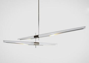 Minimalistyczna lampa wisząca składająca się z dwóch osobnych części zawieszonych na stalowym pręcie.