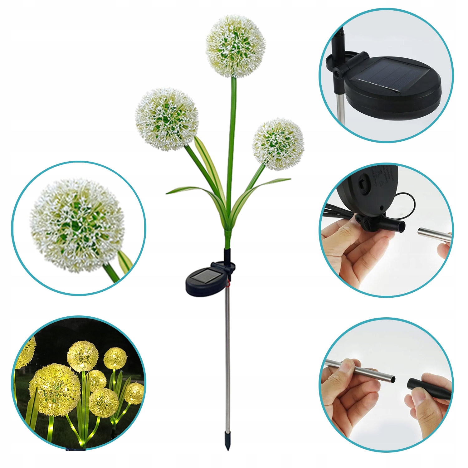☀️ Świecące diody LED w połączeniu ze sztucznymi kwiatami czosnku umieszczone są na sztycy zakończonej ostrą końcówką przeznaczoną do wbicia w ziemię.